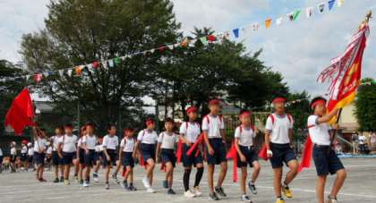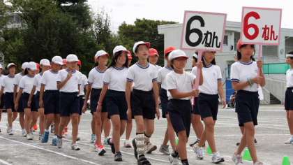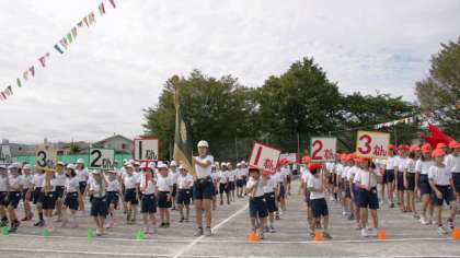 8時55分、予定通り児童が行進曲に合わせて入場。応援団を先頭に、1年から5年まで元気に行進。最後は6年生。堂々とした力強く立派でした。整列が完了して、いよいよ第38回運動会の開会です。