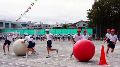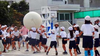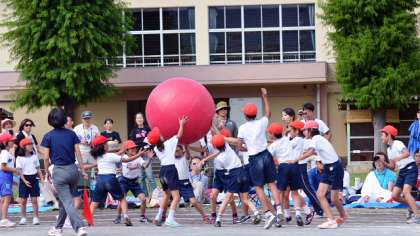 さあ、いよいよ競技、演技の開始です。はじめは全校児童で力を合わせて大玉送りをします。1、2年生は列の間を転がし、3年生以上は頭の上に持ち上げて送ります。2回戦やって1勝1敗、3回戦の結果は・・・白組の勝ちでした。