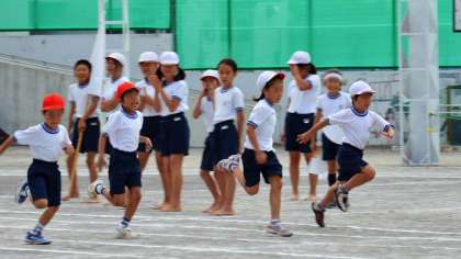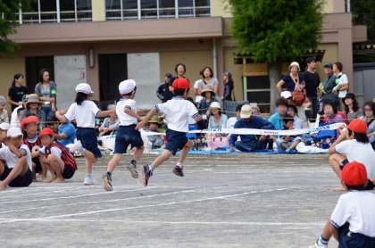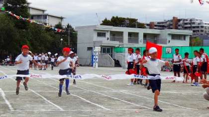 小学校に入って初めての運動会。1年生は50mを走ります。みんな一生懸命走って大接戦。ゴールのポーズも一人前です。
