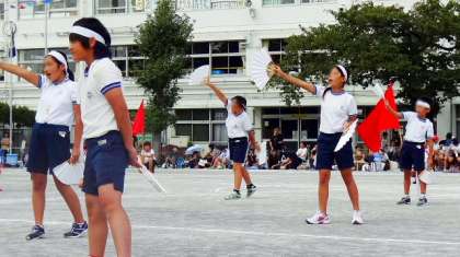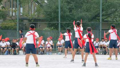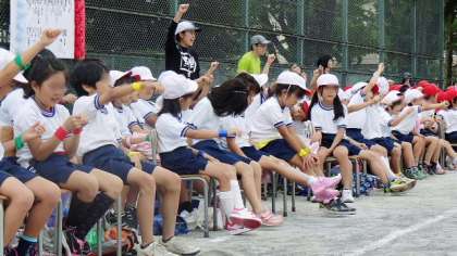 12時25分、予定通りに午後の部のスタートです。最初は応援合戦。児童席で応援団を中心に元気な応援を繰り広げます。応援のおしまいに、お客様にも協力していただき会場一周のウェーブをしました。さあ午後もがんばろう。
