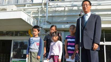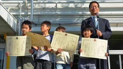 朝会で、漢字検定合格者の発表と「満点賞」の表彰。消防写生会の入選者の表彰をしました。運動会で大活躍して目立った子もいれば、漢字の勉強でがんばった子、絵の得意な子もいます。子どもたちの才能の目を伸ばし、このような場所で評価いていければと思っています。