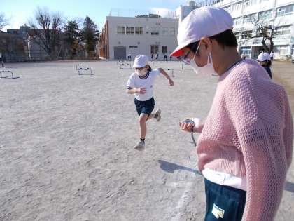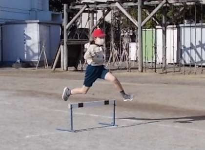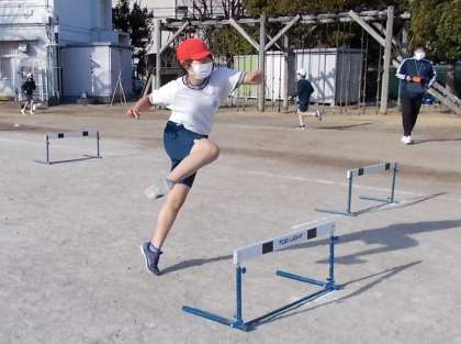 今、5年生は、体育の授業でハード走に取り組んでいます。リズムに気を付けながら、ハードルを走り越すことをがんばっています。