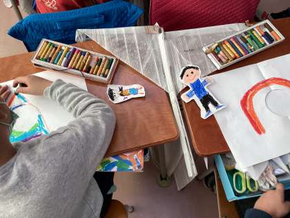 まず画用紙の四分の1を使って自分の人形を作り、冒険の始まりです。
