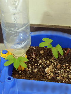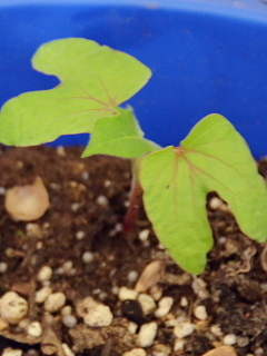 1年生がアサガオのツルでリースづくりをしています。ツルをとった後のハチに、こぼれ種から季節外れの新しい二葉が出ていました。育つでしょうか。