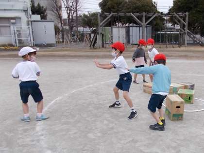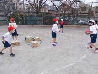今日から攻守に分かれて、ゲームをしました。3分間ハーフで、攻めと守りが交代します。攻めは一人一つボールを持ち、円外からボールを投げ、的の段ボールを輪(フープ)から出したら1点、全ての的を円外に出したら、再び積み直して攻めることができます。守りのいないところまで走ったり、声をかけ合ったり、様々な工夫をして得点を重ねました。