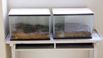 さっそく理科室前の廊下に、飼育用マット(木くず)を入れた水槽を用意して、カブトムシランドを設置しました。それぞれの水槽に10匹ずつはいっています。来年の春までこの中で少しずつ大きくなります。時々中のようすをお伝えしていきます。水槽のガラス越しに見えることもあるので、理科室前を通ったらのぞいてみてください。