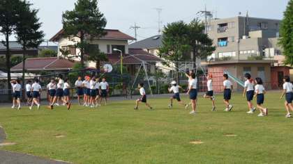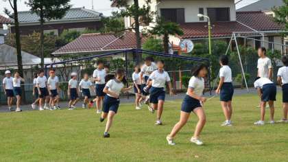 連合運動会には、クラス全員で参加する長縄跳びもあります。本番は芝生の上で行いますが、本校には芝生があるので、その上で練習できます。芝生の保護のため普段は縄跳びはできないことになっているのですが、6年生は特別です。その分がんばってほしいと思います。