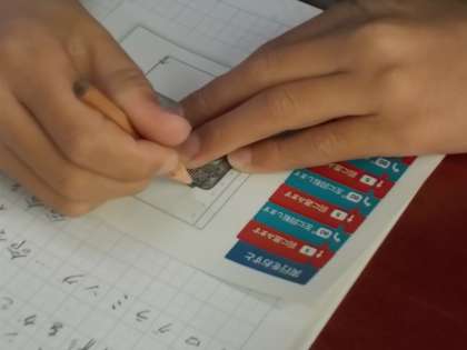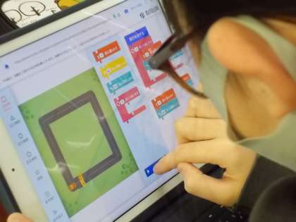 算数の授業で正多角形をかくために、タブレットを使ったプログラミング学習に取り組みました。指示通りに車を動かすとその行程が線で表されるので、図形をかくことができます。はじめは思い通りの図形をかく指示を出せませんでしたが、慣れてくると角度や辺の長さを適切に調節し、思い思いの図形をかくことができました。