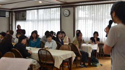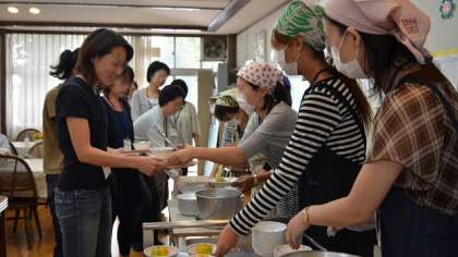 13日、PTA主催の給食試食会がランチルームで行われました。係の保護者の方が、進行役と配膳係をつとめ、栄養士と調理員からの説明には熱心に耳を傾ける姿もありました。係の皆さんのおかげで、和やかな雰囲気で試食会を行うことができました。ちなみにこの日のメニューは、ゆかりごはん、ジャンボ餃子、春雨サラダ、みかん、牛乳でした。