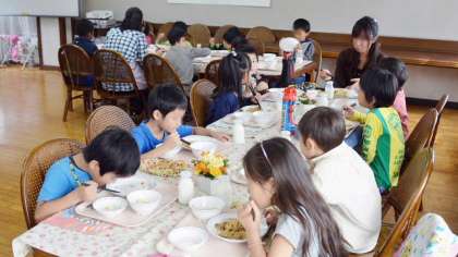 18日、ランチルームで1年生が給食です。レストランのようなつくりのランチルーム。いつもとちがう雰囲気で食べる給食はどうでしょうか。ちなみに、メニューは五目焼きそば、キュウリの中華風、フルーツヨーグルトでした。ランチルームで食べるときは、食器も磁器製の物を使っています。