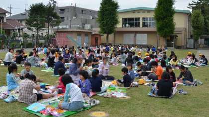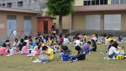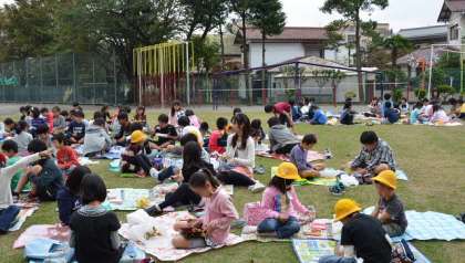 希望っ子班ロング集会の後は、希望っ子班給食です。教室で給食を各自持参した弁当箱に詰めて、今回は10月から使用開始になった芝生の上で1年から6年生まで一緒に食べました。写真だけ見ると、なんとなくどこかの公園に遠足に行っているような雰囲気ですね。