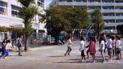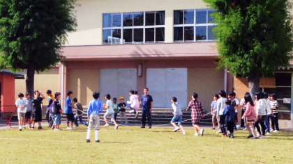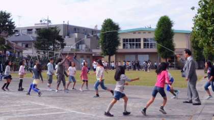 26日、連合運動会に備えて中休みの時間にもみんなで長縄跳びの練習をしている(上の写真)に刺激されて、4年生の女子が長縄跳びをし始めました。校長室のすぐそばで始めたので、私も黙っていられなくなり、縄を回す役を買って出ました。みんな一生懸命。けっこううまくなっています。楽しいひとときでした。