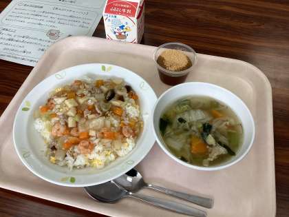 あんかけチャーハンは、炒り卵を混ぜ合わせたご飯に豚肉やえび、にんじん、だいこんなど、いろいろな具材を入れた「餡(あん)」をかけていただきます。餡は片栗粉でとろみを付けています。とろみは冷めないようにし、口当たりをよくしています。