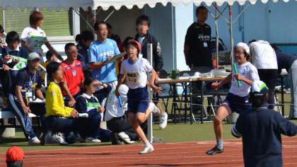午前最後の男子400mリレーのようすです。この組では見事トップでした。続いて行われた女子も力いっぱい見事なバトンのリレーでがんばりました。