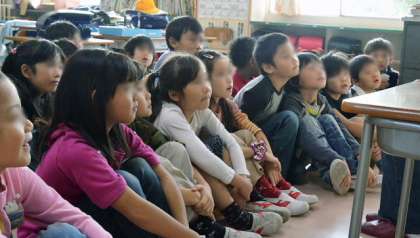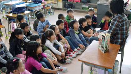 本校では保護者の方に読み聞かせをしていただいておりますが、その効果について今日はお知らせします。写真を見て下さい。表情をすべてお見せすることができないのが残念ですが、子どもたちはすてきな表情をしています。読み聞かせを聞いて、子どもたちの目には、読んでくださっている方の姿のその後ろに、物語の世界が広がっているような気がします。