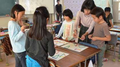 2日(水)5校時、算数の研究授業を行いました。三角形の辺に着目し、二等辺三角形と正三角形を見つけ出し、仲間わけする学習でした。教材はストローをモールでつないだものを使いました。算数は少人数学習で、1クラスを2グループにわけて授業をしています。