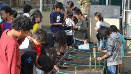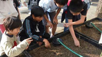説明を聞いた後、希望っ子班ごとにプランターに種と球根の植え付け作業をしました。1年生から6年生が一緒に作業している姿はほほえましいですね。二十日ダイコンはできたらすぐに収獲して家に持ち帰ってよいことにしました。楽しみですね。