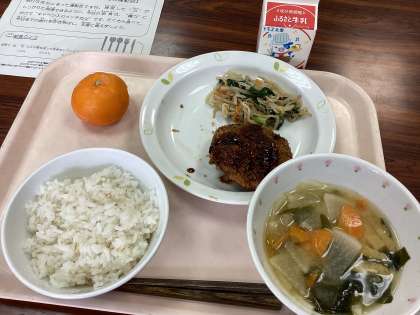 明日は待ちに待った運動会ですね。練習した「力」がしっかりと発揮できるように、今日の給食は「勝つ」にかけて「キャベツ入りのメンチカツ」です。たくさん食べて今日までの疲れを吹き飛ばし、本番に備えてください。