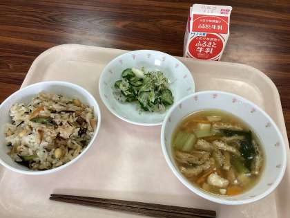 奈良県の吉野山が葛(くず)の産地であることから、すまし汁に葛粉を溶いてとろみをつけた汁を「吉野汁」と呼びます。給食ではでんぷんで葛粉の代用としています。