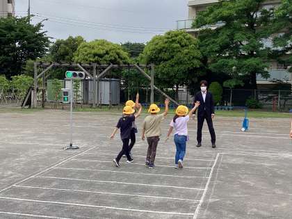 1年生は横断歩道のわたり方、物陰から出るときの確認のしかた、一時停止の標識のときの歩き方など、基本的な歩き方を学びました。どれも大切なことです。警察署の方の話をよく聞き、どの子もしっかりと練習することができました。
