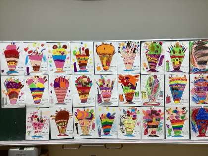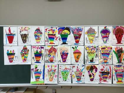 レインボーパフェ、カステラパフェ、とびっきりパフェ、ウルトラパフェ、カラフルパフェ…、いろいろなパフェが出来上がりました。描いた後は粘土でもパフェをつくり、授業の最後、みんなで紹介し合いました。