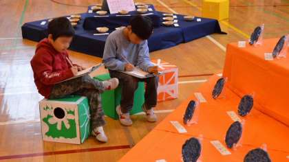 11日、2時間目は1・2・3年生が展覧会の作品鑑賞をしました。それぞれ「鑑賞カード」をもって、気に入った作品についてのコメントを書きました。中には10数点について書いている子もいました。
