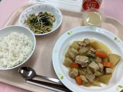 今日は、ご飯に麦を使っています。麦には便秘を解消し、肥満を防ぐなどの食物繊維や、骨や歯を丈夫にするカルシウムなどが多く含まれています。日本では白米が高価だった戦後、白米と混ぜて「麦ご飯」として食べられていました。今では、健康効果や美容を考えて食べられています。プチプチした食感も楽しんでください。