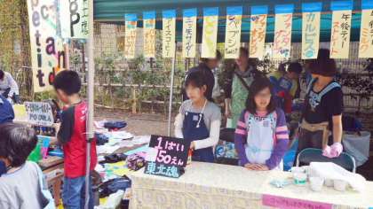 児童館に遊びに行っている子どもたちが出しているお店もありました。写真の上から2枚は手作り品を売っているお店です。子どもたち手作りの小物が大好評でした。下の写真は飲み物屋さんでお手伝いする本校の子どもたちです。このような機会は貴重な経験になりますね。
