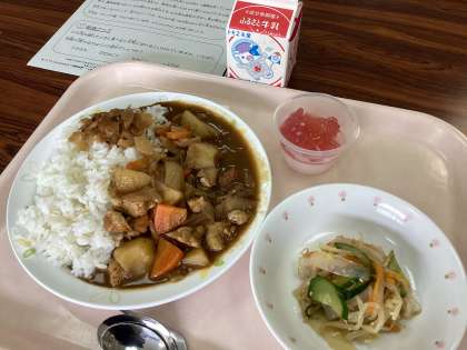 今日のカレーライスは、チキンカレーです。鶏のもも肉とむね肉の2種類を使っています。もも肉はももから足にかけた部分で、筋肉が多いためやや硬く、噛みごたえがあります。鶏肉特有のおいしさが味わえる部分です。むね肉は脂肪が少なく、身は柔らかくて淡泊であっさりとしていて、低カロリーです。みんなが食べるお肉はみんなの体を作るのに大切な「たんぱく質」が含まれています。