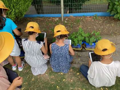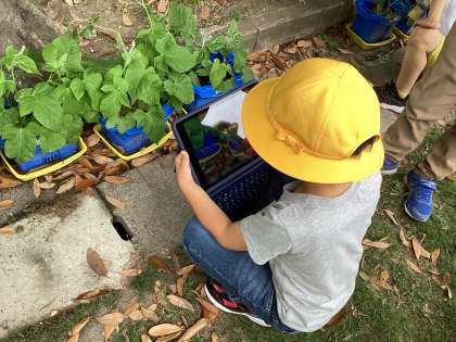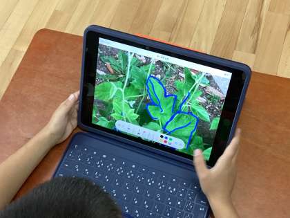1年生はタブレットが配付され、各クラスでタブレットのルールを聞いてから活用していきます。この日は、朝顔の写真を撮りました。写真を撮ってから「編集」をし「ペン機能」を使って朝顔の輪郭や模様をなぞりました。肉眼で見るよりも分かりやすくなるので、朝顔の輪郭や模様がよく分かりました。