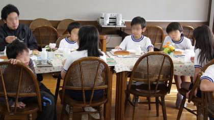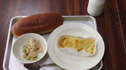 本校では、学年交代でランチルームを使った給食を行っています。15日は4年2組です。いつもとちがう場所、いつもとちがう食器で食べる給食は、おいしく感じるそうです。ランチルームで使う食器は磁器製です。一番下の写真が普通教室で使う食器です。お盆も一回り大きい物を使っています。