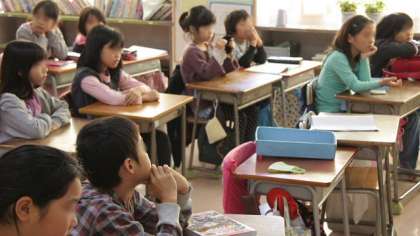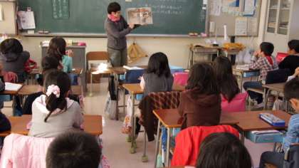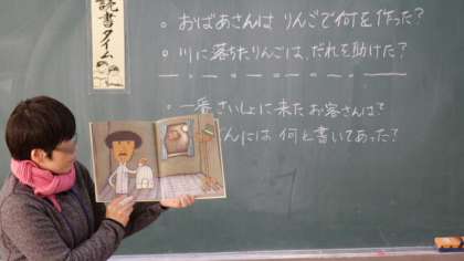 写真は3年生の読書タイムのようすです。黒板に本の題名、聞く時に注意してほしいことが書いてありました。読書に興味を持たせるという目的だけでなく、本の中身にも注目させ、読解力も育むこともねらった取り組みです。