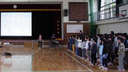 18日(金)朝、体育館で音楽集会を行いました。音楽委員会の伴奏でみんな声をそろえて歌いました。集会でいつもがんばるのは1年生。集会に向けて朝の会で練習しています。すばらしい。音楽委員会も短い時間で伴奏の練習をしてがんばっています。
