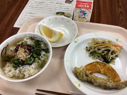 今日は「冷やし梅茶漬け」です。梅、ゆかり、ごま、のりを合わせたものをのせて、冷えた昆布茶をかけていただきます。蒸し蒸しするこの時期には、食欲増進、疲労回復の効果のある梅を食べるのが一番です。お茶漬けは、さらさらと流し込んでしまいがちですが、よく噛んでいただきましょう。