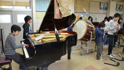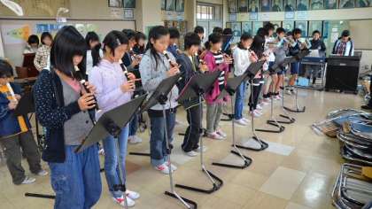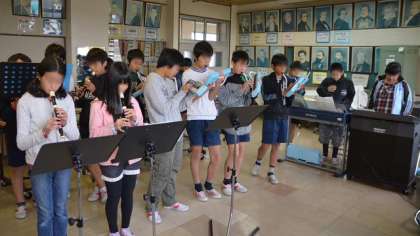 28日、5時間目に6年生の子が校長室と職員室を訪れてきました。「今、合奏ができあがったので、お時間があったら聞いていただけますか?」とのことです。「はい、よろこんで」と、どこかで聞いたような返事ですぐに音楽室へ。子どもたちが準備万端、演奏の用意をして待っていました。曲名は「風をきって」。音楽専科教諭の指導で演奏が始まりました。どの子も真剣な表情です。
