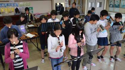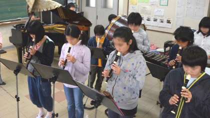 軽快なリズムにのって、しっかりした演奏です。最後に「少しずれてしまった」と言って顔を見合わせる子どもたち。大丈夫、まだできあがったばかりですから、みんなで曲想を感じ取りながら、意見を出し合ってよい合奏に仕上げていきましょう。6年生を送る会や感謝の会に披露できるようこれからも練習していきます。