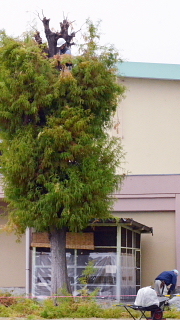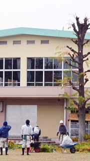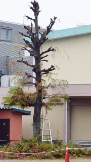28日、区の用務班の皆さんにお願いして、体育館前のメタセコイアを剪定してもらいました。本校の主事も手伝い、昼をはさんで6時間ほどできれいさっぱりになりました。一番左の写真の上の方で作業しているのがわかりますか。高いところをいとわず作業してくださっている用務班の皆さんに感謝です。