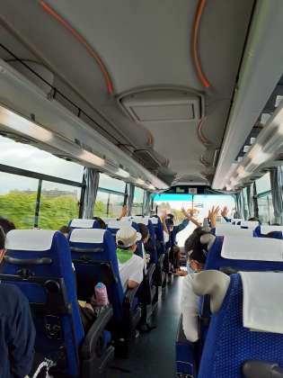 バスの中ではなぞなぞや心理テストをして楽しんでいます。