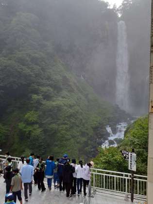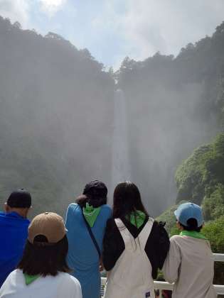 エレベーターに乗って観爆台まで向かい、華厳の滝を見学しました。水が97メートルの岸壁を一気に落下する様子は壮大で、子どもたちも驚いていました。水しぶきを浴び、気持ち良さそうでした。
