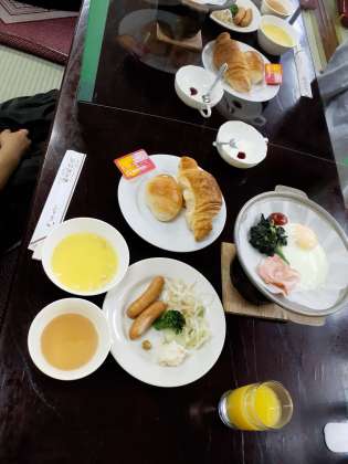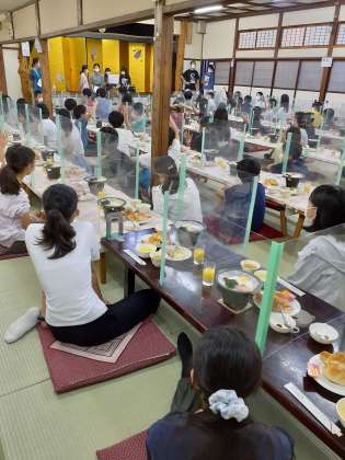 散策を終え、宿舎での最後の食事です。毎食事では、食事係がクイズを出したり号令をかけたりして進めてくれました。3日間、美味しいお料理を用意してくださった宿舎の皆さんに、感謝の気持ちをもっていただきます。