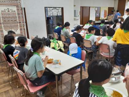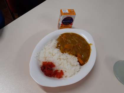 今日のお昼ごはんは、カレーライスです。みんな美味しそうに食べています。
