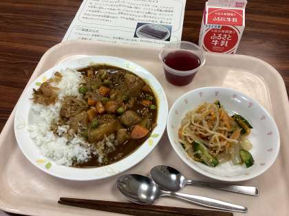 今日は、こんにゃくの入った「こんにゃくサラダ」です。こんにゃくは、こんにゃく芋から作られる食べ物で、インドシナ半島が原産地で日本に伝わってきました。こんにゃくを作る際には、こんにゃく芋を粉末にしたものと石灰などのアルカリ性のものと一緒になると固まる性質があり、それを利用して作られます。歯ごたえも味わってください。
