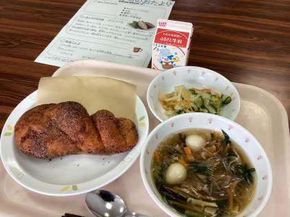 今日は、あげパンです。いつもの「きなこあげパン」ではなく、ココアをまぶしています。ココアは、チョコレートと同じ原料のカカオ豆から脂肪分を取り除き、粉末にしたものです。ココアそのものは甘くないので、グラニュー糖を加えています。