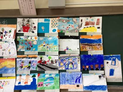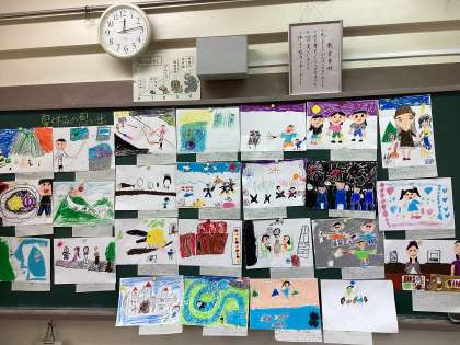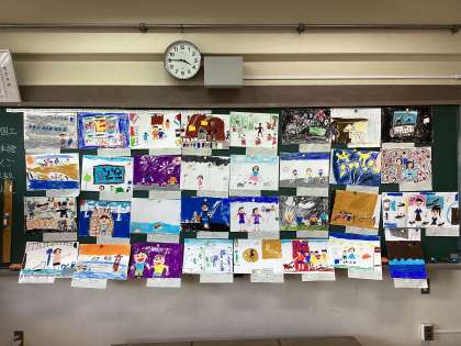 2学期最初のテーマは「夏休みの思い出」。夏休みに楽しかったことを発表し合った後、思い思いに描き始めました。完成したら名札に名前と題名、説明を添え黒板に掲示し、発表会をしました。友達同士楽しい思い出を聞き合う、和やかなひと時でした。過ぎ去った夏休みを懐かしみ、楽しく取り組んでいました。