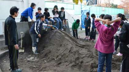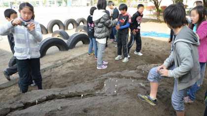 30日3・4時間目、5年生の「流れる水のはたらき」の授業です。月曜日にみんなで作った砂山にいよいよ水を流して、川のモデル実験です。グループで1台ずつカメラをもってようすを観察・撮影しました。砂を深く削っていく水のはたらきに興味をもって学習できました。