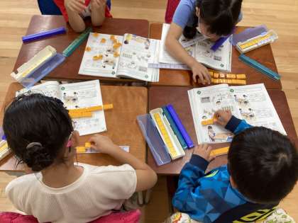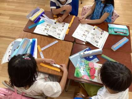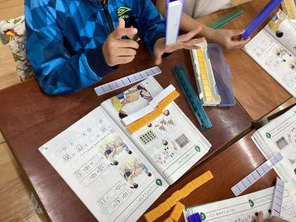 この日の算数の学習では、数のまとまりに着目しながら、20までの数を数える学習をしました。ブロックを使って、いくつあるかを数えました。2とびや5とびの数え方をて数えたり、10といくつの見方を使って数えることができました。