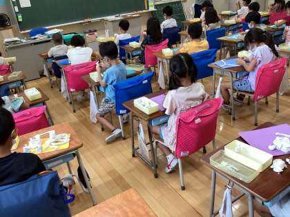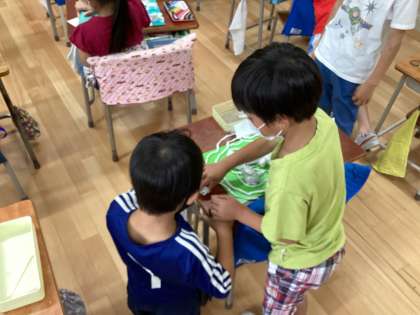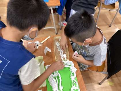 今週の図工はねんど遊び。自分の動物園を創りました。小さい画用紙を用意しておいたら、地図や看板を作っている子もいました。制作した後は友達同士で遊びに行き合いました。