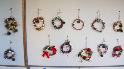 1年生が自分で育てたアサガオのつるを使って作ったリースです。飾り付けを工夫して、すてきな作品に仕上がりました。家に持ち帰ったら、ぜひ飾ってください。