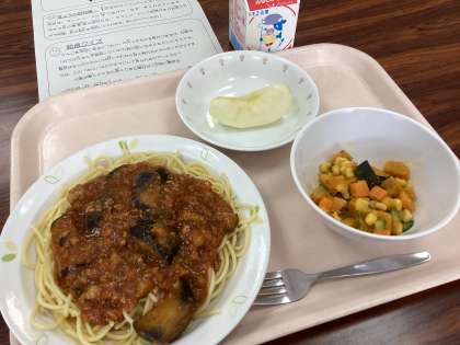 今日はミートソースに、油で揚げた「なす」を加えています。なすの皮の黒紫色の部分には「ナスニン」という色素があり、血液をさらさらにしてくれる他、肌の老化予防もしてくれます。