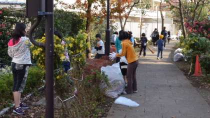7日午後、全校児童で、地域の公園や緑道にでかけて清掃活動をする、「地域美化タイム」を行いました。校庭に集まり作業の手順などを聞いた後、それぞれの担当の場所に移動してさっそく作業に取りかかりました。この時期は枯れ葉が多いので、主な作業は落ち葉拾いです。学校から持ち寄ったほうきで掃き集めたり、トングや手で一生懸命拾いました。